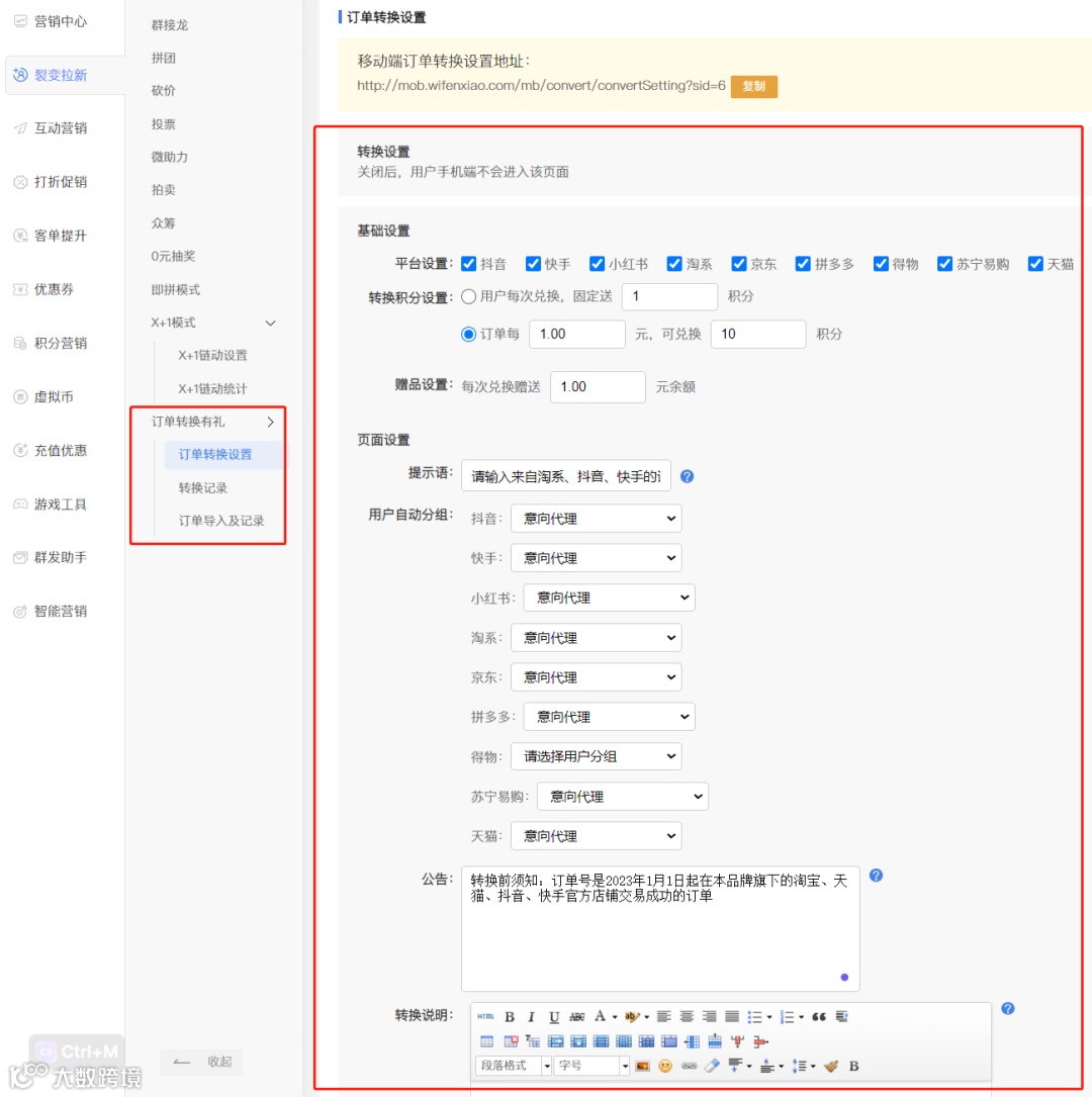 【订单转换有礼】是启博微分销小程序商城系统第236期更新的新功能,支持微分销系统私域商城与天猫、淘宝、拼多多、京东、抖音、快手、小红书等公域电商平台打通,支持平台订单一键转入微分销系统。
