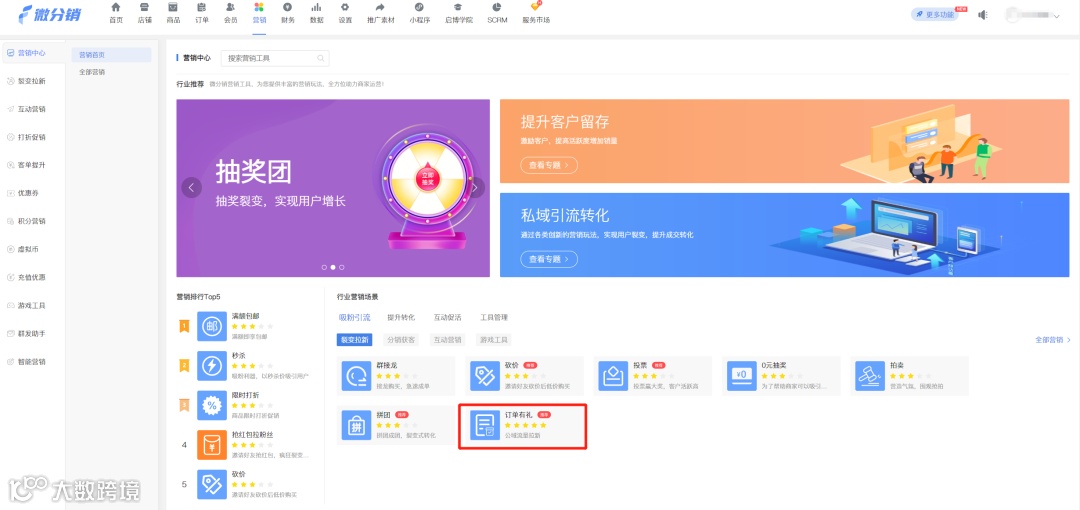 商家要想借助“订单转换有礼”功能实现公转私,可以在微分销管理后台——营销-裂变拉新-订单转换有礼或者直接在全部营销功能内搜索“订单有礼”。