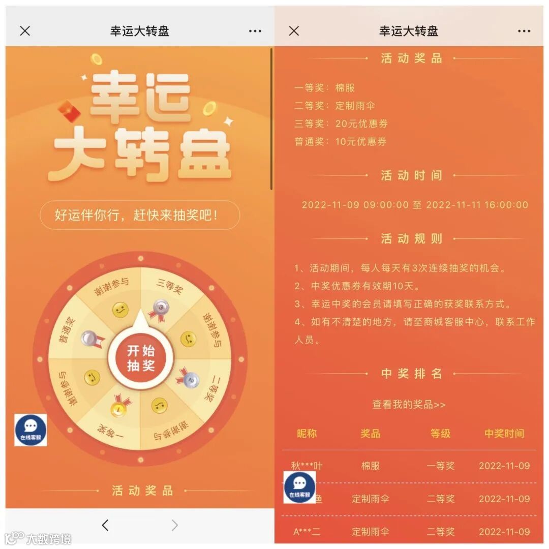 泳者之星微商城上线双11“幸运大转盘”抽奖活动,设置四等奖励,用实物+优惠券的形式,吸引大家无门槛参与游戏。