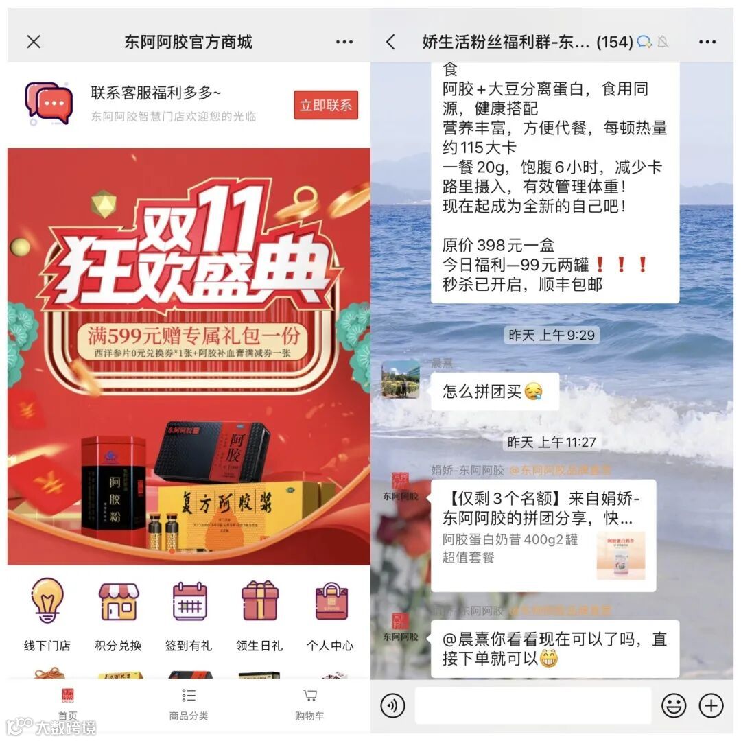 本次大促东阿阿胶在微商城内上线“双11狂欢盛典”活动,限时秒杀+满599元赠专属礼包。