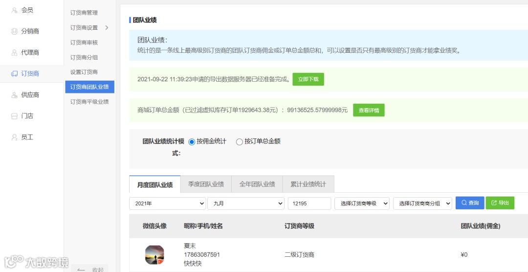 订货商-订货商团队业绩-按“月度”、“季度”、“全年”导出,昵称/手机/姓名可以分割导出