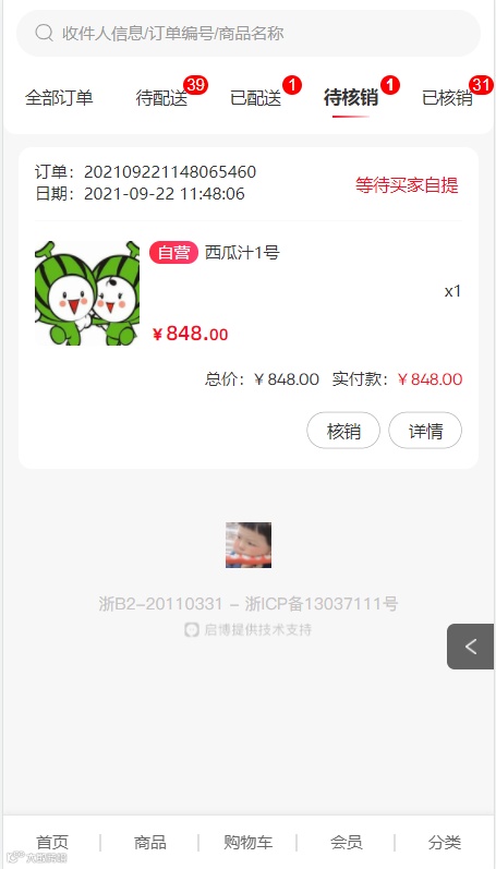 手机端门店中心-门店订单标识展示门店的待配送、已配送、待核销、已核销订单数量标识,方便用户查看数字标识;