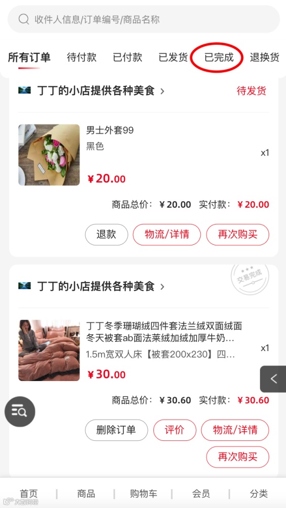 手机端-订单列表,新增 “交易完成”订单状态,可以筛选出“交易完成”的订单;