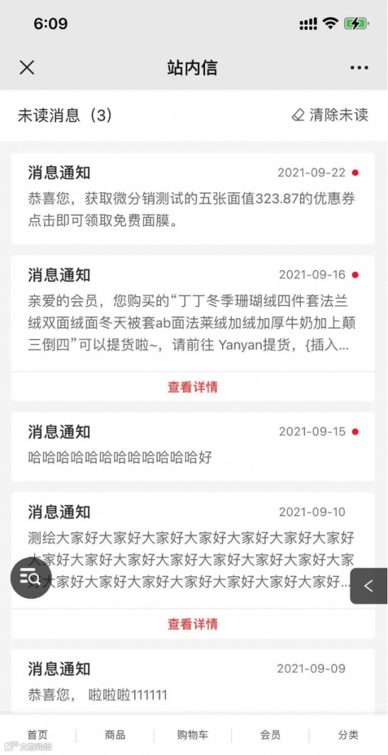 手机端会员中心-右上角 “站内信”页面内容优化,点击消息通知内容可以跳转到对应消息页面。