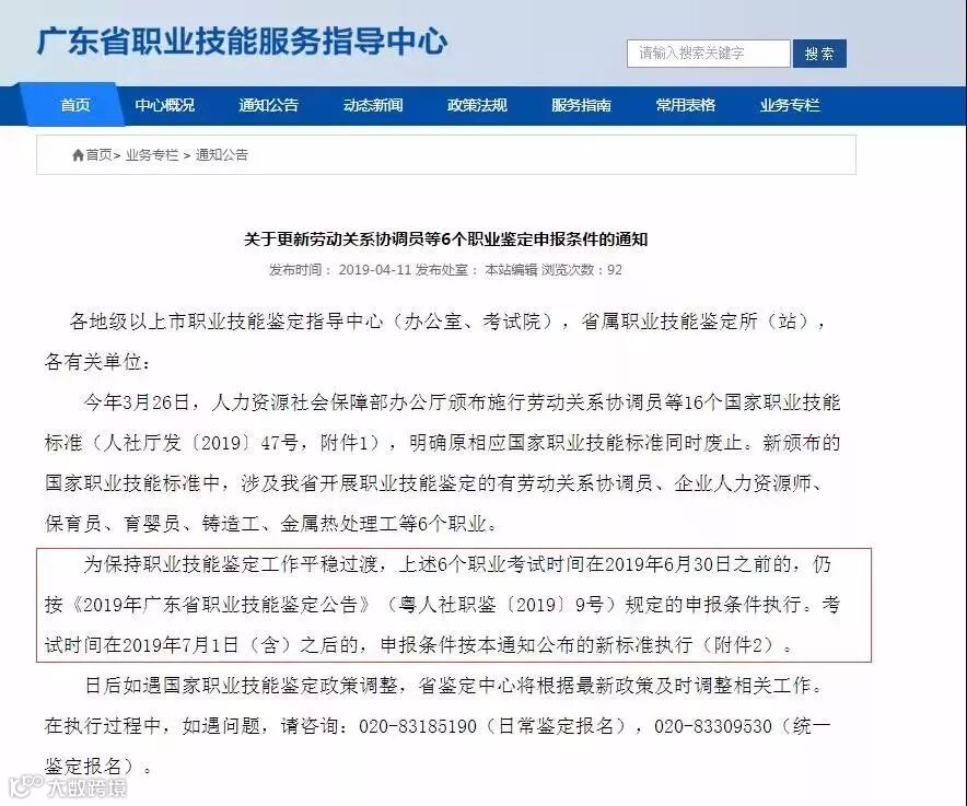 为保持职业技能鉴定工作平稳过渡,上述6个职业考试时间在2019年6月30日之前的,仍按《2019年广东省职业技能鉴定公告》(粤人社职鉴〔2019〕9号)规定的申报条件执行。考试时间在2019年7月1日(含)之后的,申报条件按本通知公布的新标准执行(附件2)。