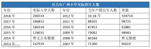 根据广州市教育统计手册的数据,每年小学入学(实际招生)人数,都比当年户籍出生人数相差9万以上。而2018年的实际入学人数,更是超过了20万。