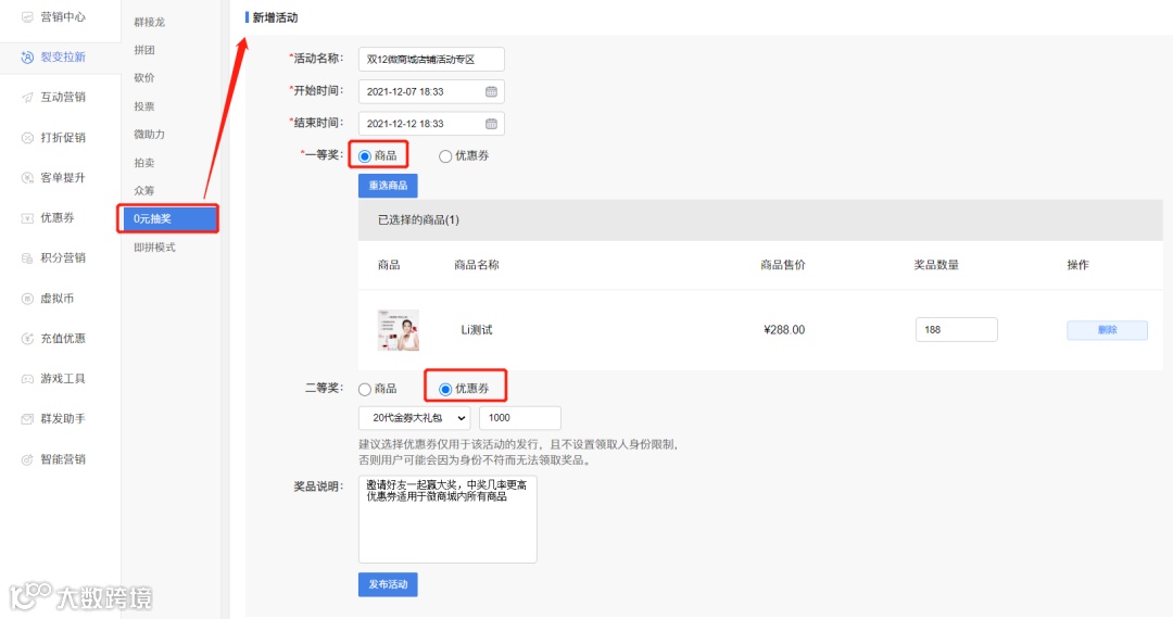 在启博微分销的系统后台,商家可以自定义设置活动名称、活动的开始及结束时间,抽奖的奖品选择、奖品数量,奖品可以是商品或者是优惠券,加强紧迫感,进一步刺激客户分享,灵活配置奖品,各级奖品按需配置,从而提高转化率!