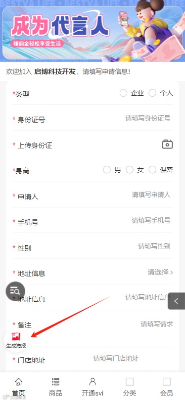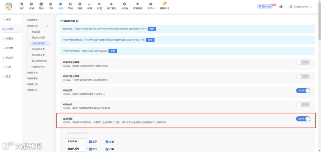 开启【生成海报】设置,分销商、代理商、订货商、供应商、门店申请页面可生成推广码进行保存和分享可绑定关系