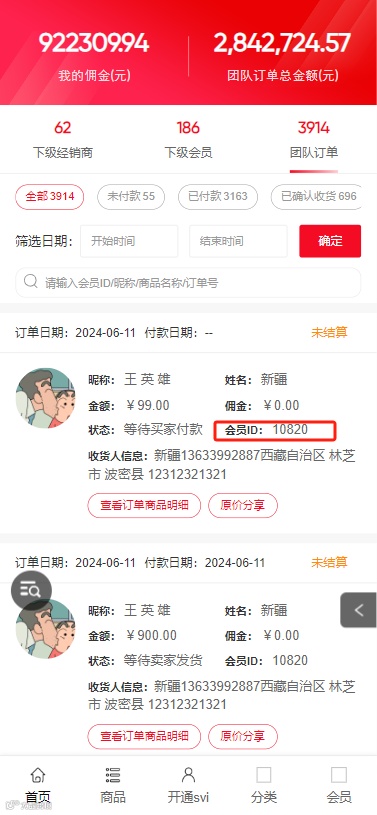 移动端订货商中心的团队订单列表,新增会员ID的信息。