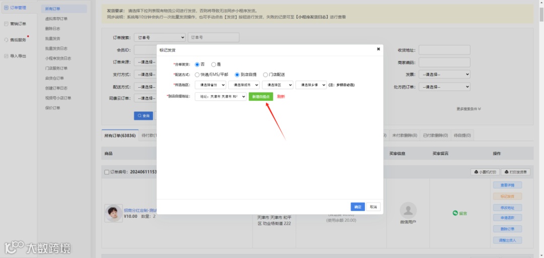 发货配送方式选择到店自提时,可以直接点击新增自提点跳转至提货点管理的新增页面,新增完成后回到当前页点击刷新可获取最新添加的自提点地址。