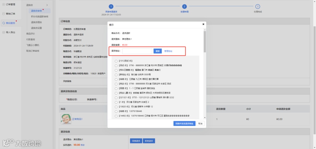 新版退换货后台提交地址,搜索框可根据电话号码与地址进行快速筛选