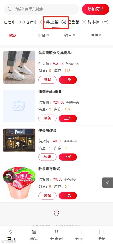 移动端供应商中心添加待上架状态商品列表,可操作商品上架
