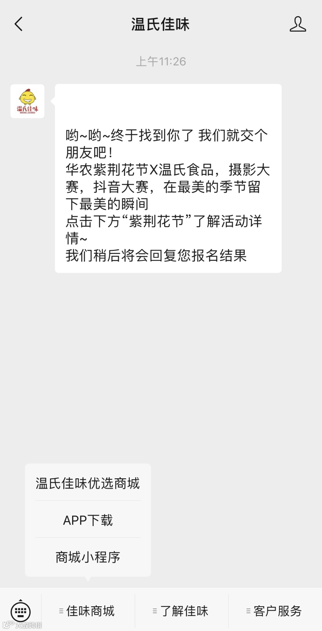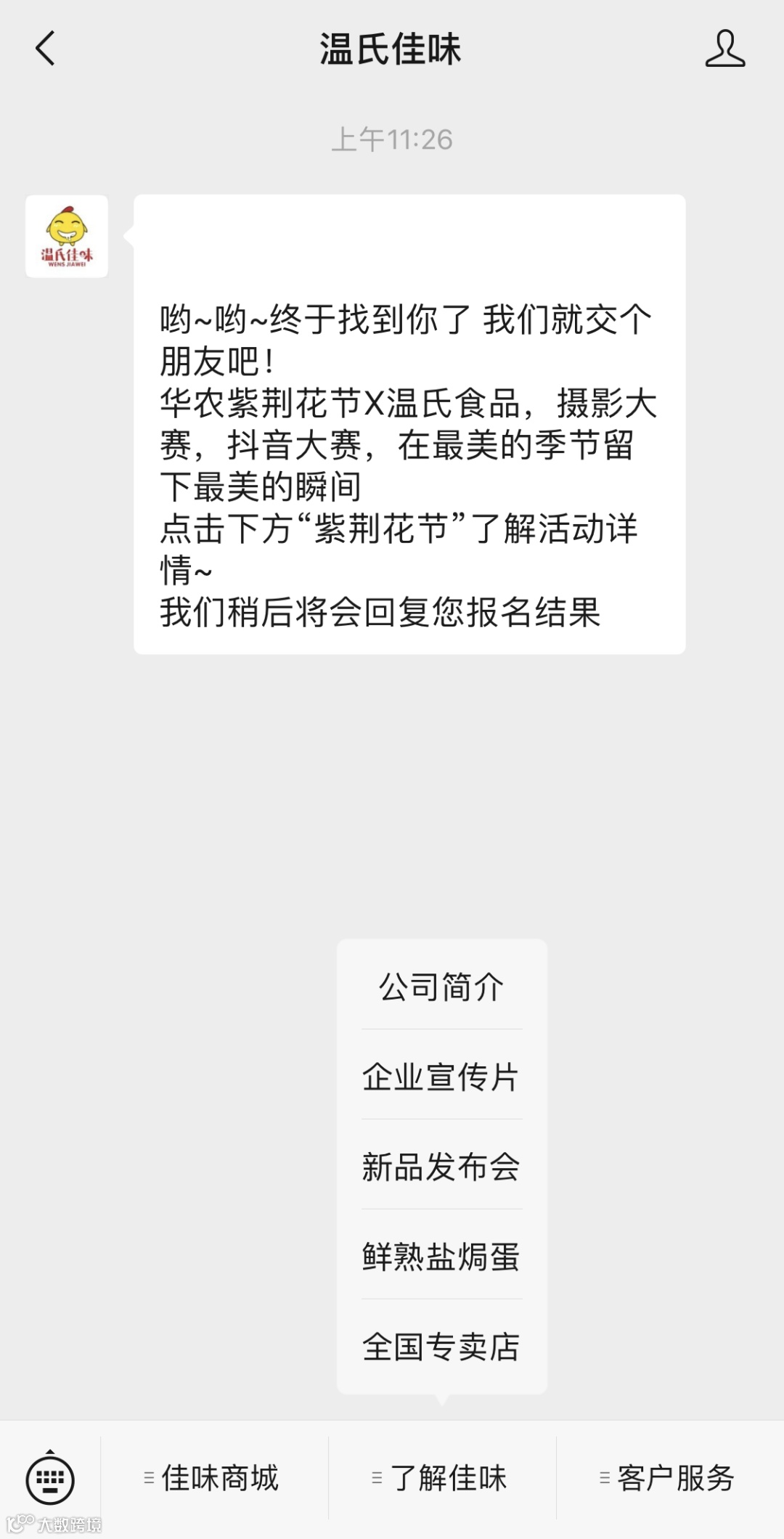 「温氏佳味优选商城」将公司的详细介绍放入公众号菜单栏,用户随时点击了解,通过对公司背景、运营现状、荣誉等方面的介绍,提高用户对公司的熟悉度,提高曝光度。同时,还在简介中国详细描述了产品的来源,增加了用户对品牌的信任感。