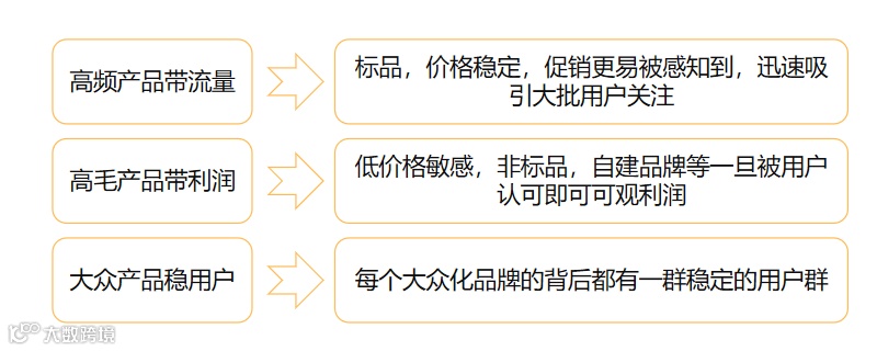 通过刚需高频产品来让用户感受到平台产品的便宜,从而使用户建立平台价格便宜的心智认知,增加用户粘性,吸引更多流量进入,再通过高毛产品和用户终身价值来赚回利润。