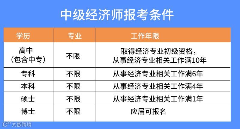 目前,取得高中学历以上学历(包含中专),工作满一年即可报考初级经济师,下图是中级经济师报名条件。