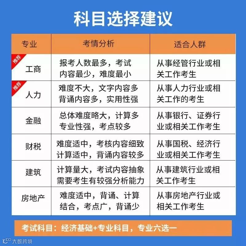 考试共分12个专业。综合难度、通过率、市场供求关系等因素,目前较受欢迎的四个专业分别为工商、人力、金融以及财税。大家可以根据下图来选择最适合自己的专业。
