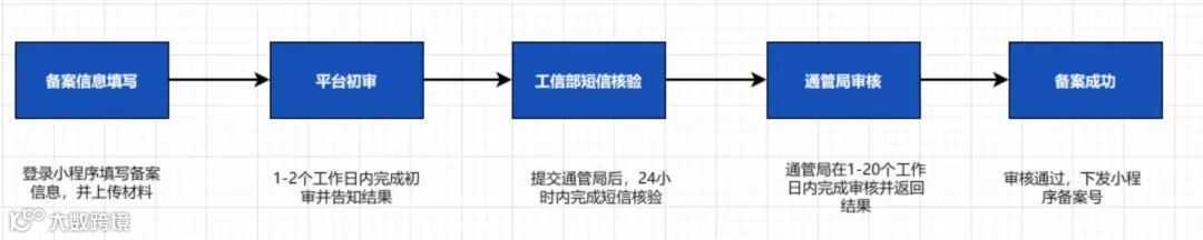 备案整体流程总共分为五个环节:备案信息填写、平台初审、工信部短信核验、通管局审核和备案成功。