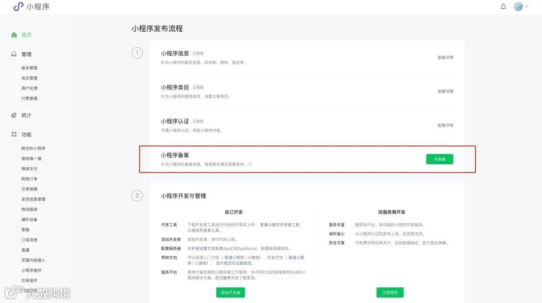 开发者可在小程序首页点击【去备案】即可进入备案流程