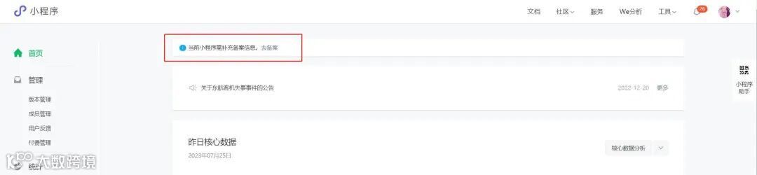 小程序管理后台顶部会提示“小程序需补充备案信息”的提醒,点击【去备案】即可进入备案流程