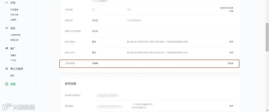 也可以在小程序管理后台设置模块-小程序备案,点击【去备案】进入备案流程。