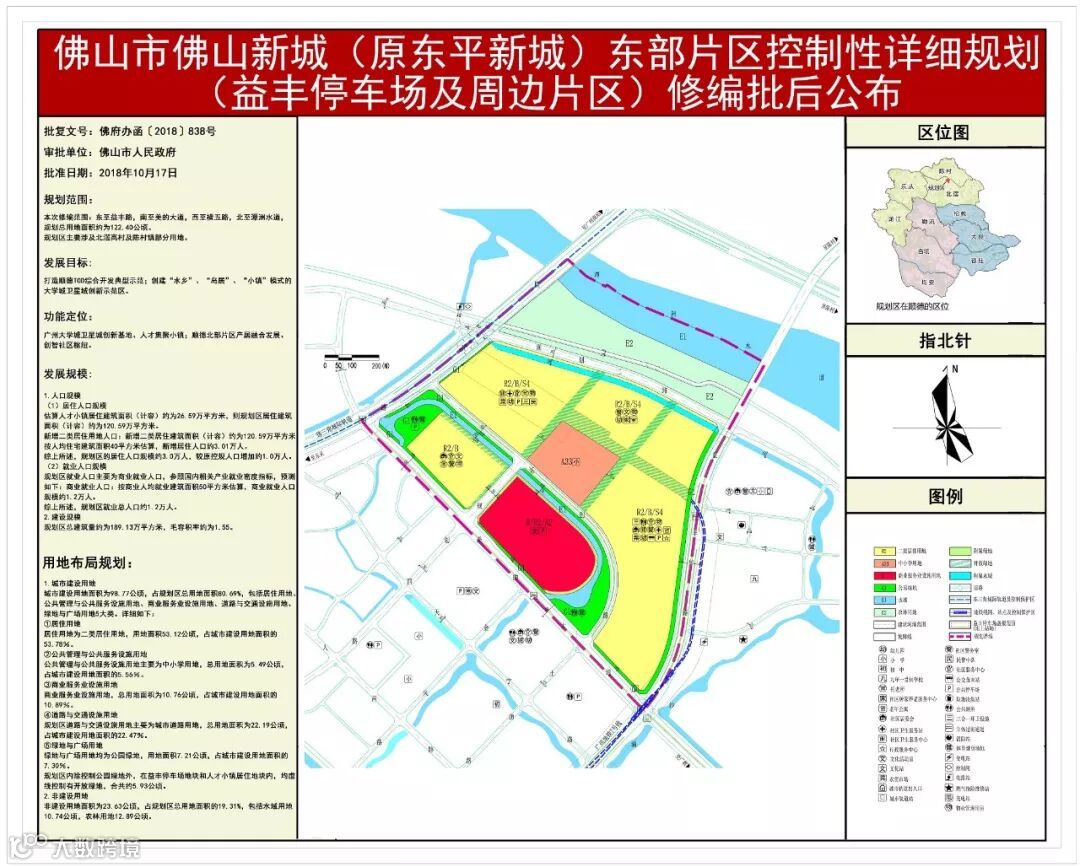 根据佛山市自然资源局修编批后公布的《佛山市佛山新城(原东平新城)东部片区控制性详细规划(益丰停车场及周边片区)》,规划区主要涉及的北滘高村及陈村镇部分用地拟打造成顺德TOD综合开发典型示范;创建“水乡”、“岛居”、“小镇”模式的大学城卫星城创新示范区。