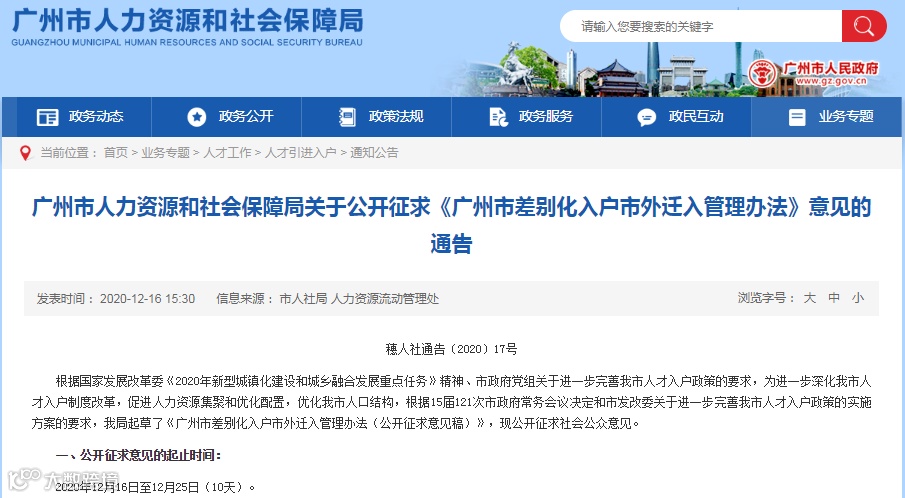 广州市人力资源和社会保障局关于公开征求《广州市差别化入户市外迁入管理办法》意见的通告