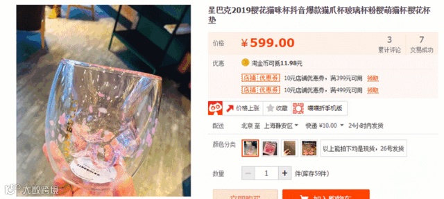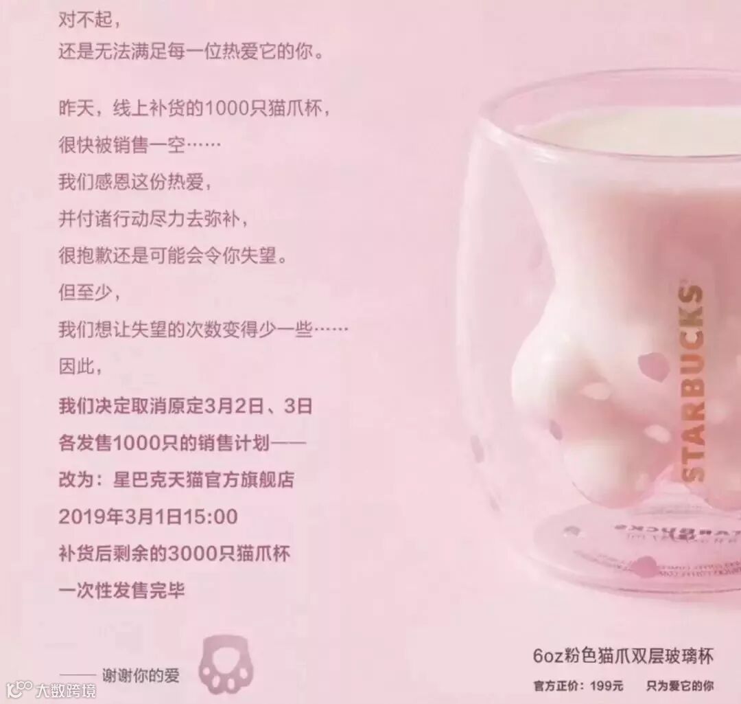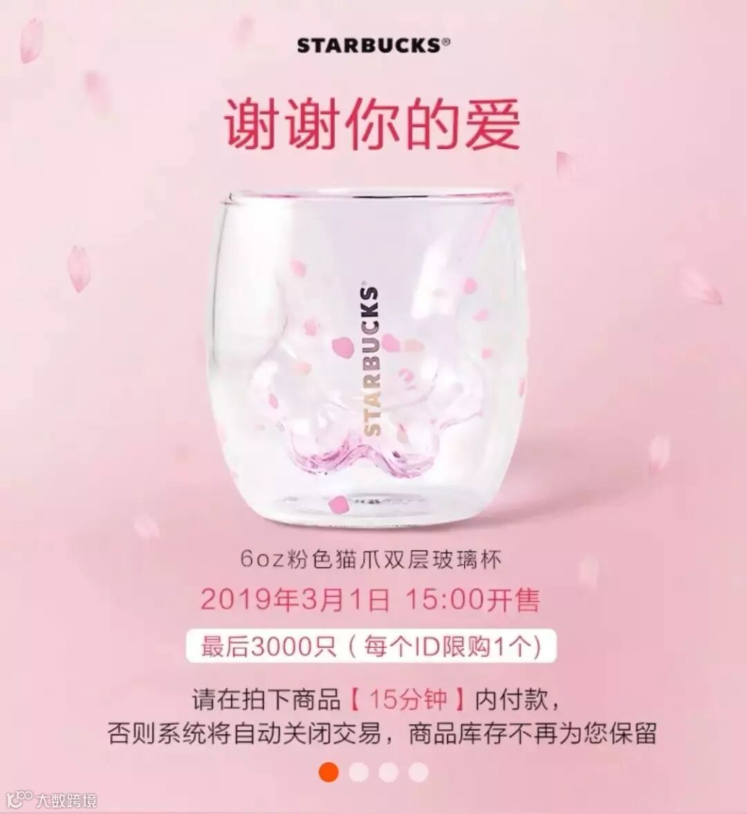 2月28日下午3点,在各地的星巴克引起“猫爪杯大战”的6oz粉色猫爪双层玻璃杯在星巴克天猫官方旗舰店正式开售,1000只猫爪杯在开售不到一分钟的时间内被“抢光”,网友表示“有种双11抢购的感觉”。