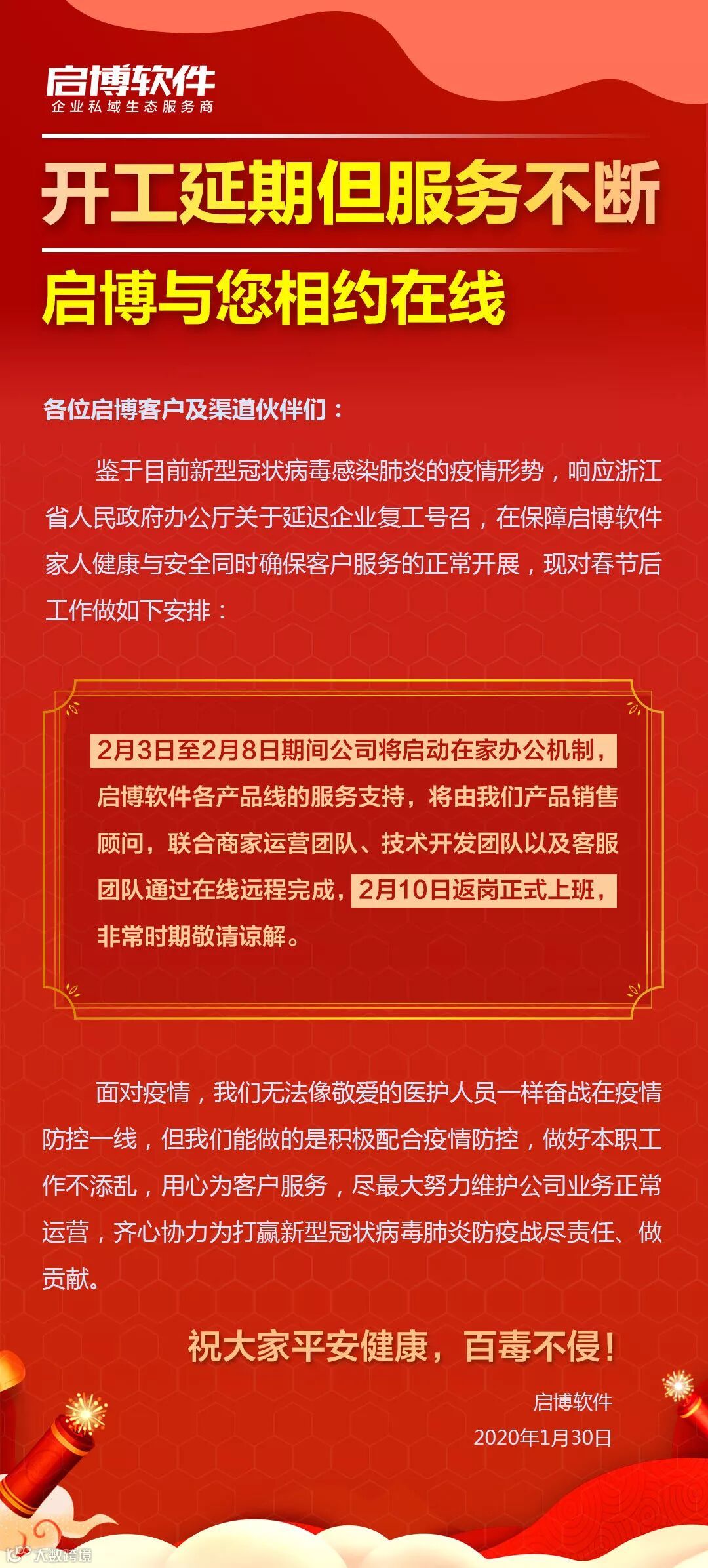为做好“新型冠状病毒肺炎”疫情防控工作,减少人员聚集,保障所有商家伙伴们及本公司员工的身体健康,贯彻落实国务院关于疫情防控的重要指示,根据中央及浙江省相关部署,经启博软件管理层研究决定于2020年2月3日至2月8日启动在家办公机制。暂定 2 月 10 日(正月十七)返岗正常上班。
