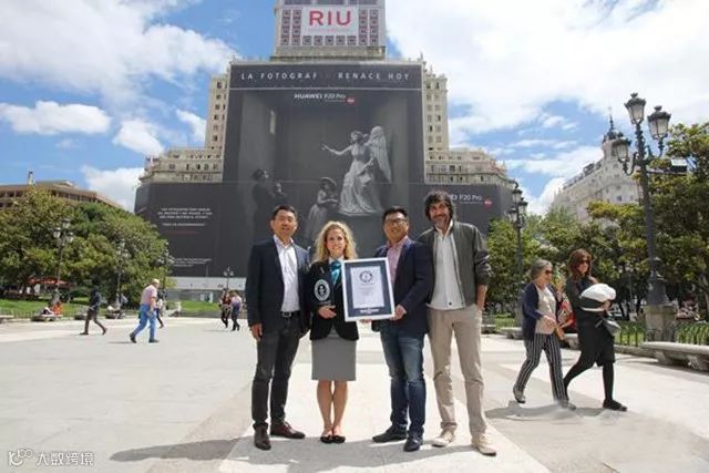 西班牙首都马德里西班牙大厦主立面上,展示的华为P20Pro手机广告获颁最大户外广告吉尼斯世界纪录。