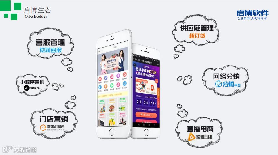 启博专注电商10年,发展至今,已经形成了较为完善的产品生态圈,囊括了核心业务微分销、小程序,以及微聊客服、趣订货、粉盟直播等全方面的产品服务,致力于为客户提供更全面、更有价值的电商服务。
