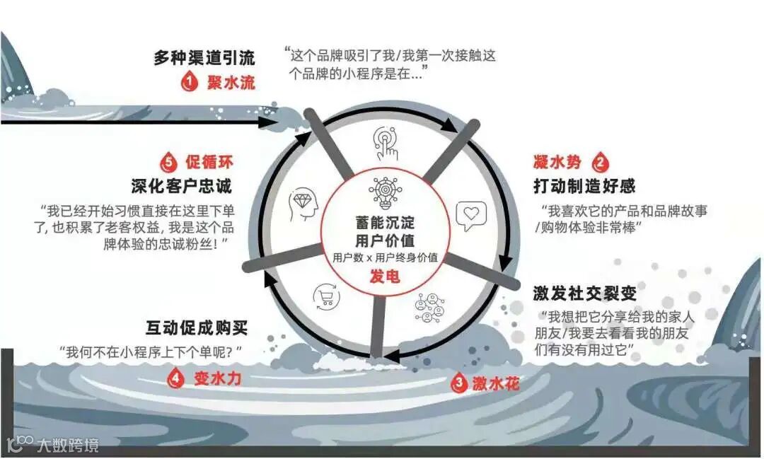 私域增长水轮指的是企业外部的私域策略,包括五个步骤:多渠道引流、打动用户制造好感、激发用户社交裂变、增加互动促成购买和深化客户忠诚。