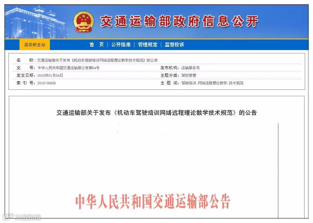 根据《国务院办公厅转发公安部交通运输部关于推进机动车驾驶人培训考试制度改革意见的通知》(国办发〔2015〕88号),交通运输部组织制定了《机动车驾驶培训网络远程理论教学技术规范》并公开发布