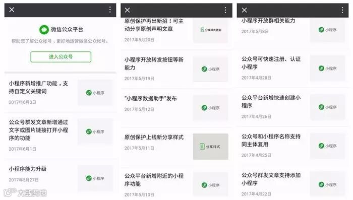 没有一点防备,近期,小程序动作频频,“微信公众平台”公众号历史消息中,齐刷刷也全都是有关“小程序”的消息推送:
