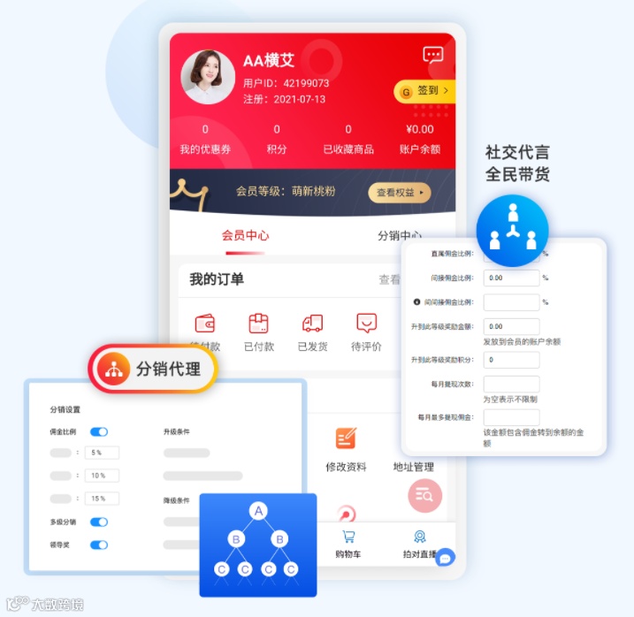 启博微分销微商城系统有全面分销能力,基于微信朋友圈的传播,以分销商为中心让粉丝实时有效的获取朋友圈流量并快速分享购买分佣以利益为驱动力,激励用户分享;分销绑定层级,快速引流。社交分销,实现全民带货。