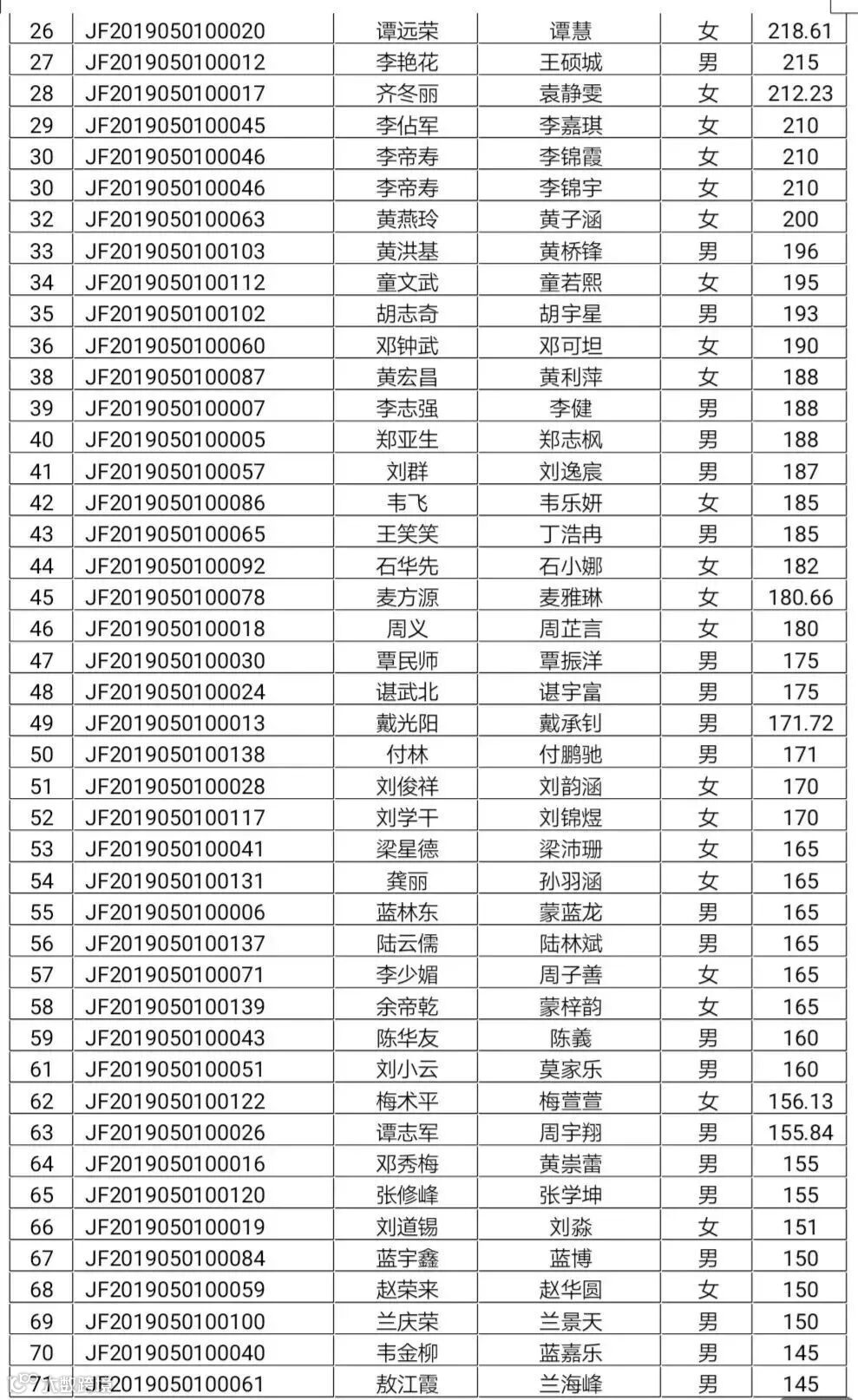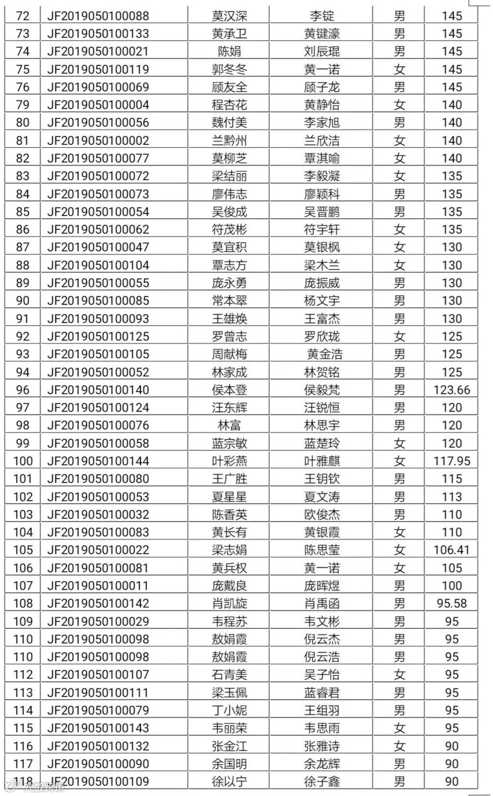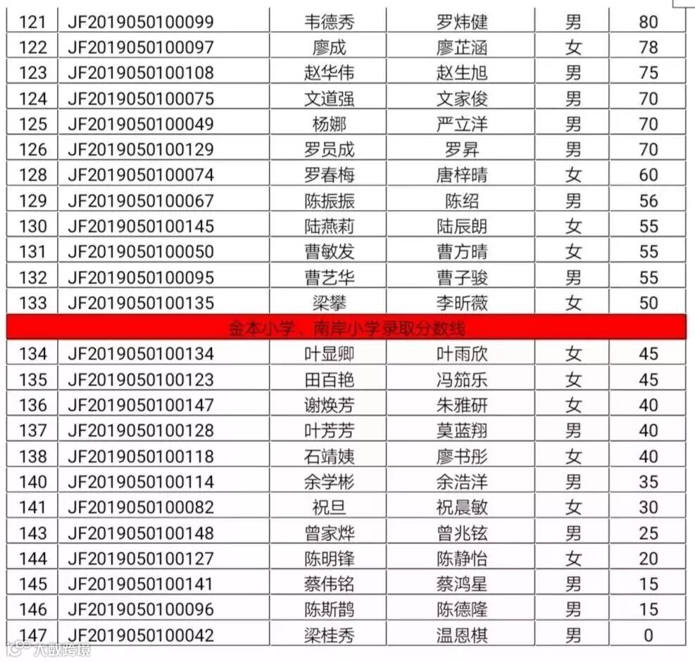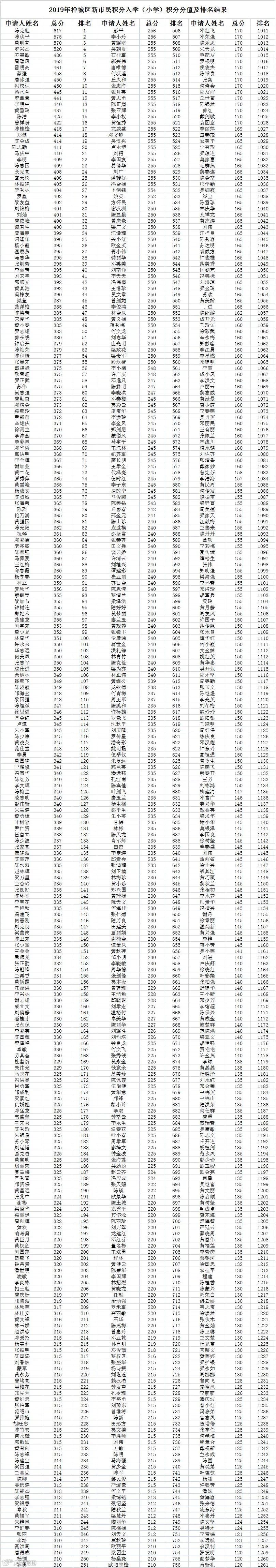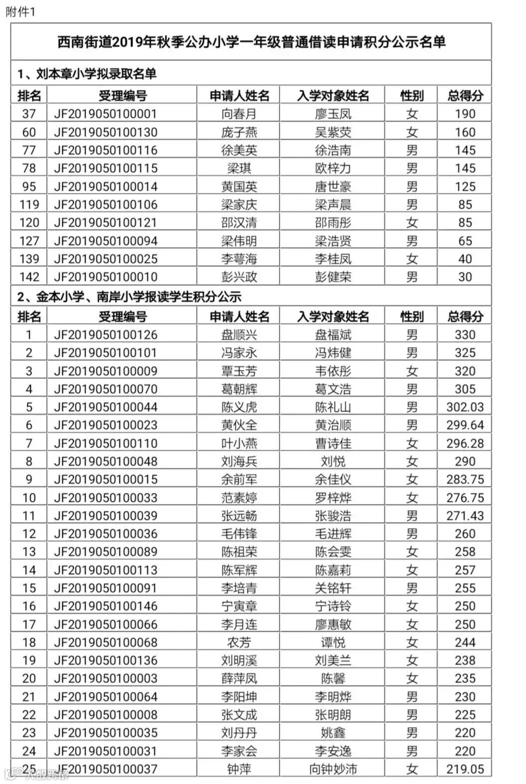 2019年西南街道秋季公办小学一年级普通借读申请积分公示名单: