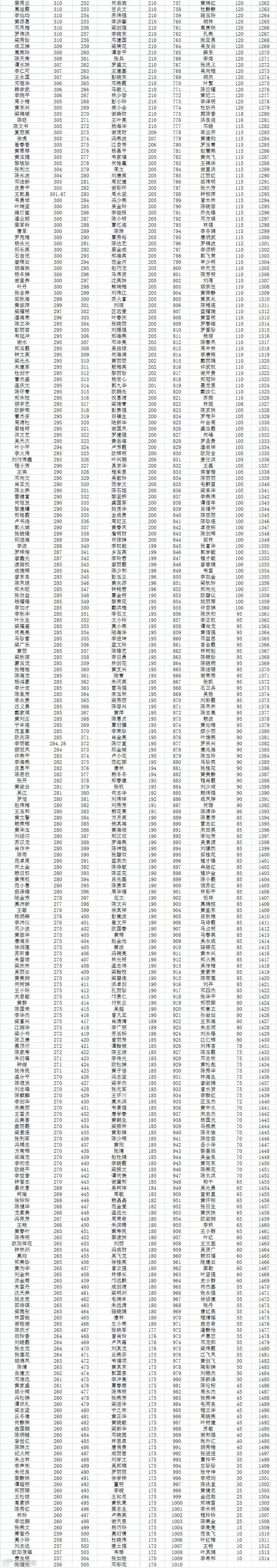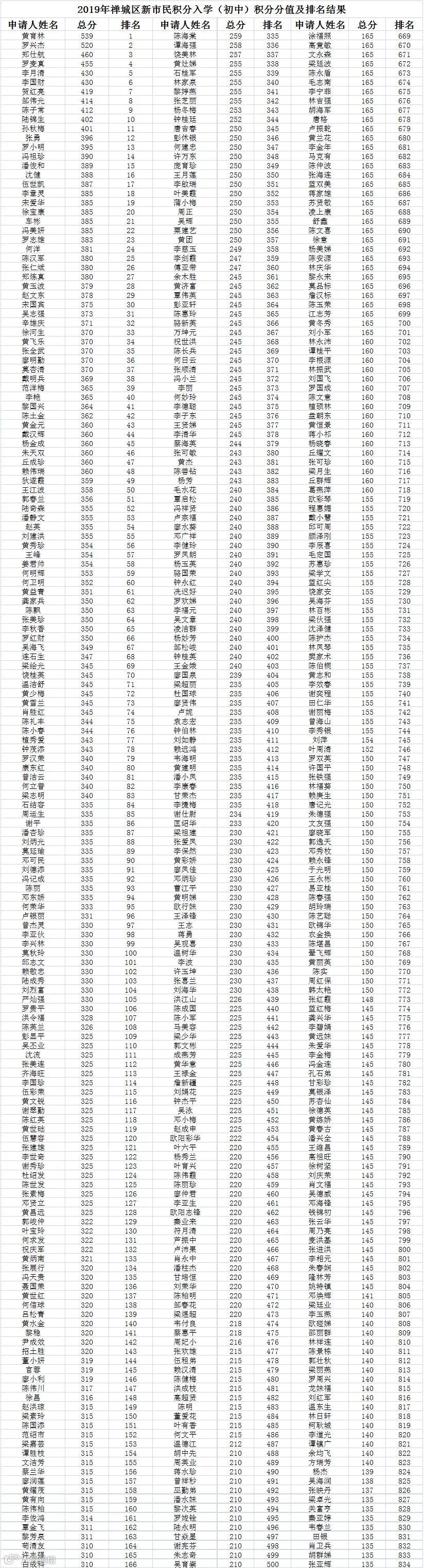 2019年禅城区新市民积分入学(初中)积分分值及排名结果: