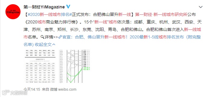 《排行榜》显示,2020年,15个进入“新一线”的城市依次是:成都、重庆、杭州、武汉、西安、天津、苏州、南京、郑州、长沙、东莞、沈阳、青岛、合肥、佛山。其中与去年相比,合肥和佛山取代了昆明、宁波,第一次进入新一线城市名单。