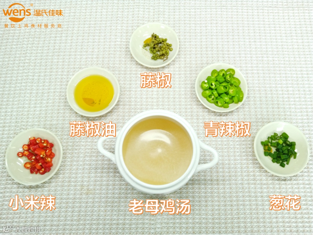→在老母鸡汤中依次加入小米辣、青辣椒、藤椒油、葱花。