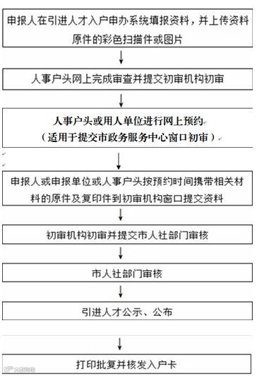 (市直单位)网上填报资料→人事户头审核并提交初审机构→网上预约→初审机构初审→市人社局审核→网上公示→公示无异议打印批复→核发广州市入户人员信息卡。