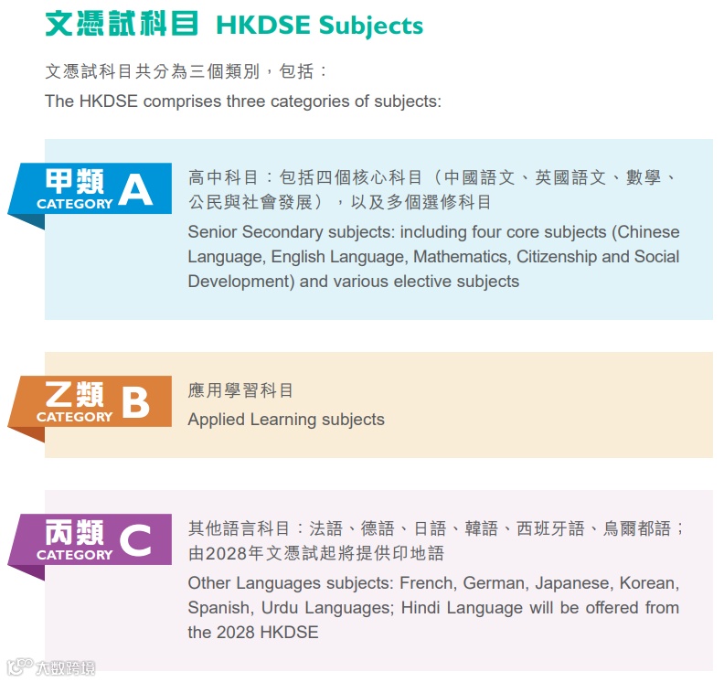 DSE科目设置兼顾知识广度与个性化发展,考生需完成“4门核心科目+2-3门选修科目”的学习体系。其中,核心科目为中国语文、英国语文、必修数学及公民与社会发展;选修科目涵盖20余门,考生可根据自身兴趣、职业规划自由选择,既满足不同发展方向的需求,也能在优势科目上冲刺高分,提升名校申请竞争力。