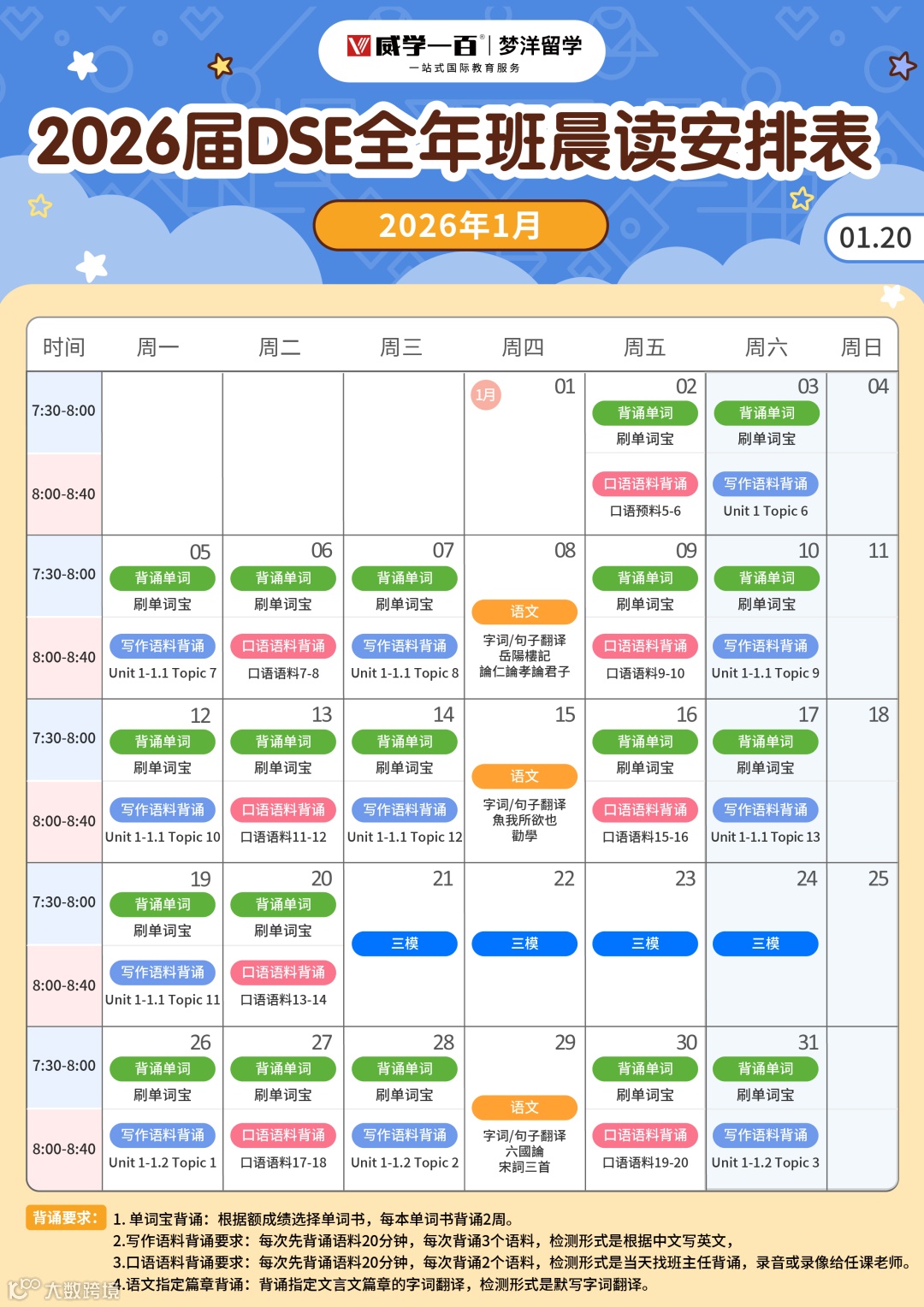 我们深知晨读是知识积累的黄金时段,冲刺阶段的晨读不是单一的机械背诵,而是升级为针对性极强的“知识充电营”。融合单词精细化背诵、写作语料积累、口语素材练习、文言文专项突破等多元内容,全方位为学员的冲刺阶段筑牢知识根基。