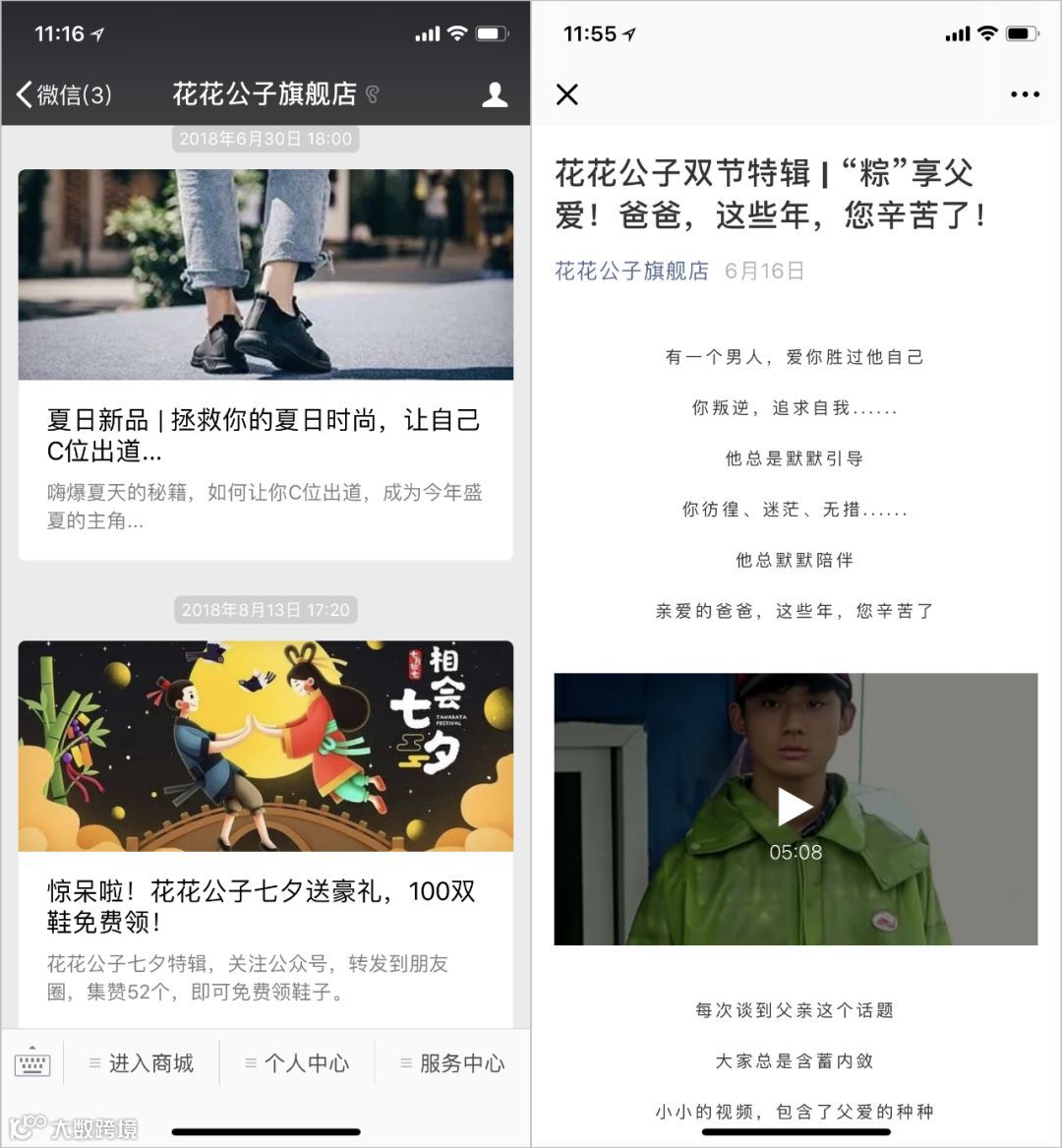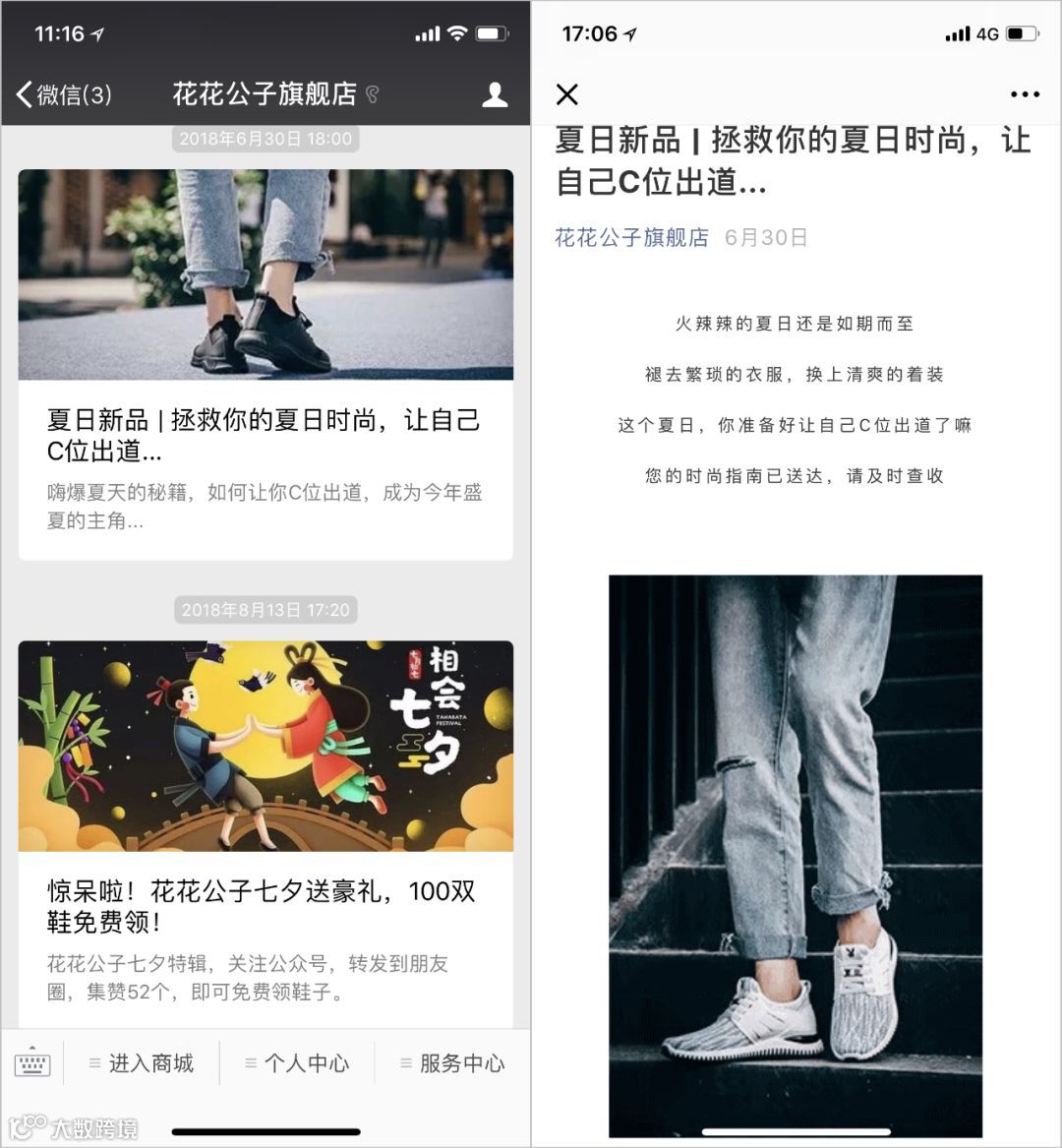 为确保商城的相关动态能够及时传达给粉丝用户,每次商城的重要上新活动、营销活动等,商家都会通过“花花公子旗舰店”的公众号向用户推送消息,同时在推送的消息中,为用户提供更多关于商城鞋子穿搭方法的知识普及,提高用户体验。