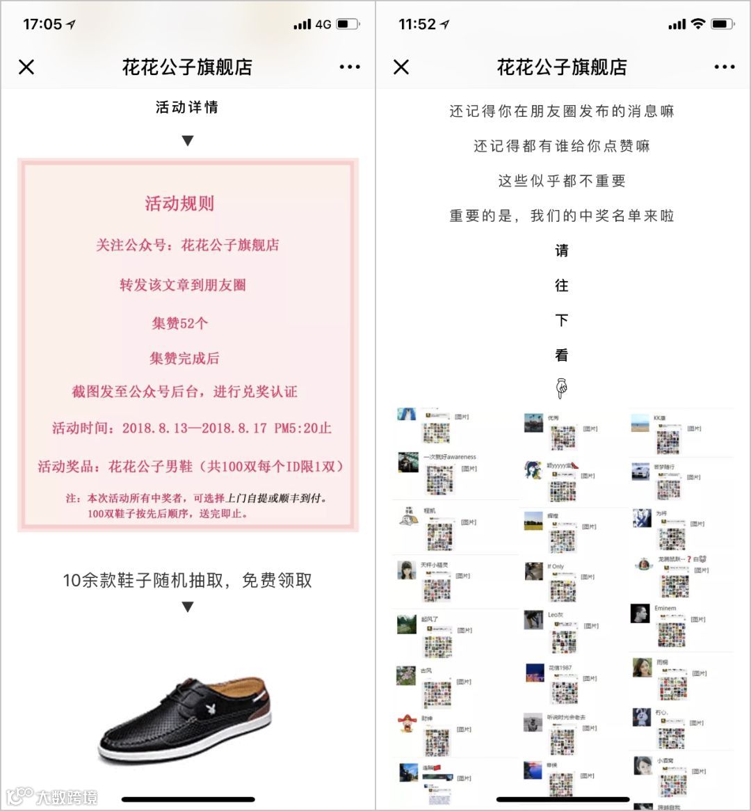 无论是商城的新老客户,只需关注花花公子的公众号并将活动转发到朋友圈,集满52个赞即可获得花花公子男鞋一双。用户无需消费,只需要完成简单的分享集赞操作就能获得奖品;商家利用用户朋友圈的裂变,能够让活动被更多新用户看到并参与,从而扩大品牌在线上渠道的影响力。