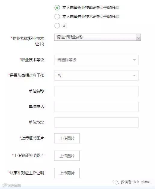 在“技术能力”栏目下,需要本人选择技术加分的类型,并且输入相应的专业名称、等级、就业单位、证书等信息,并上传相应的证明材料。
