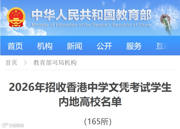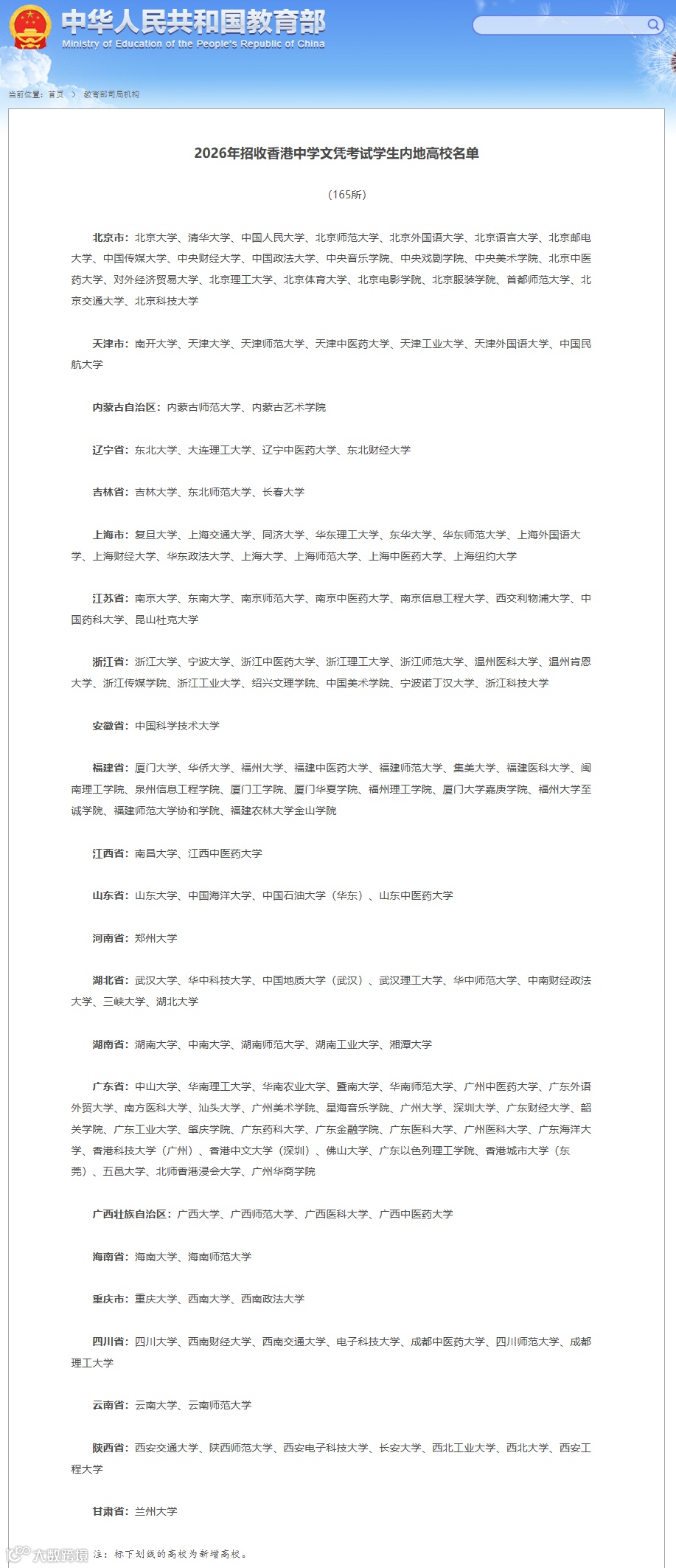 近日,教育部正式公布2026年内地高校招收香港中学文凭考试(DSE)考生计划,内地高校名单总数从2025年的145所跃升至165所,新增20所,覆盖全国29个省(市、自治区)。