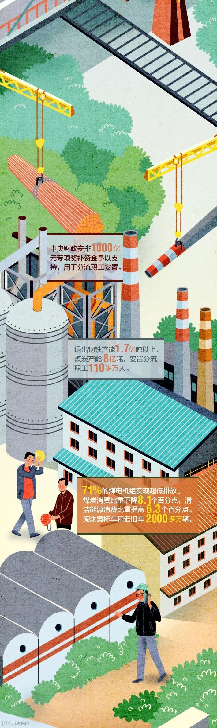 去产能:再压减钢铁产能3000万吨左右,退出煤炭产能1.5亿吨左右。