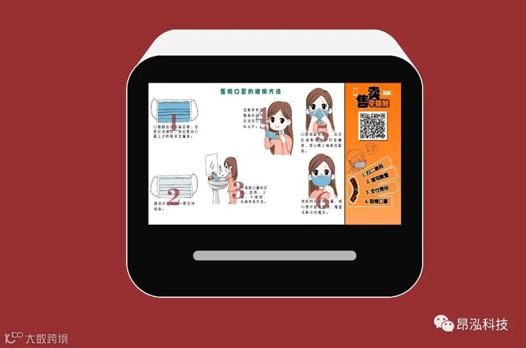 扫一扫屏幕上的二维码,输入需要购买的口罩数量,支付相应用的费用,稍等就可以有取物口上取得口罩。