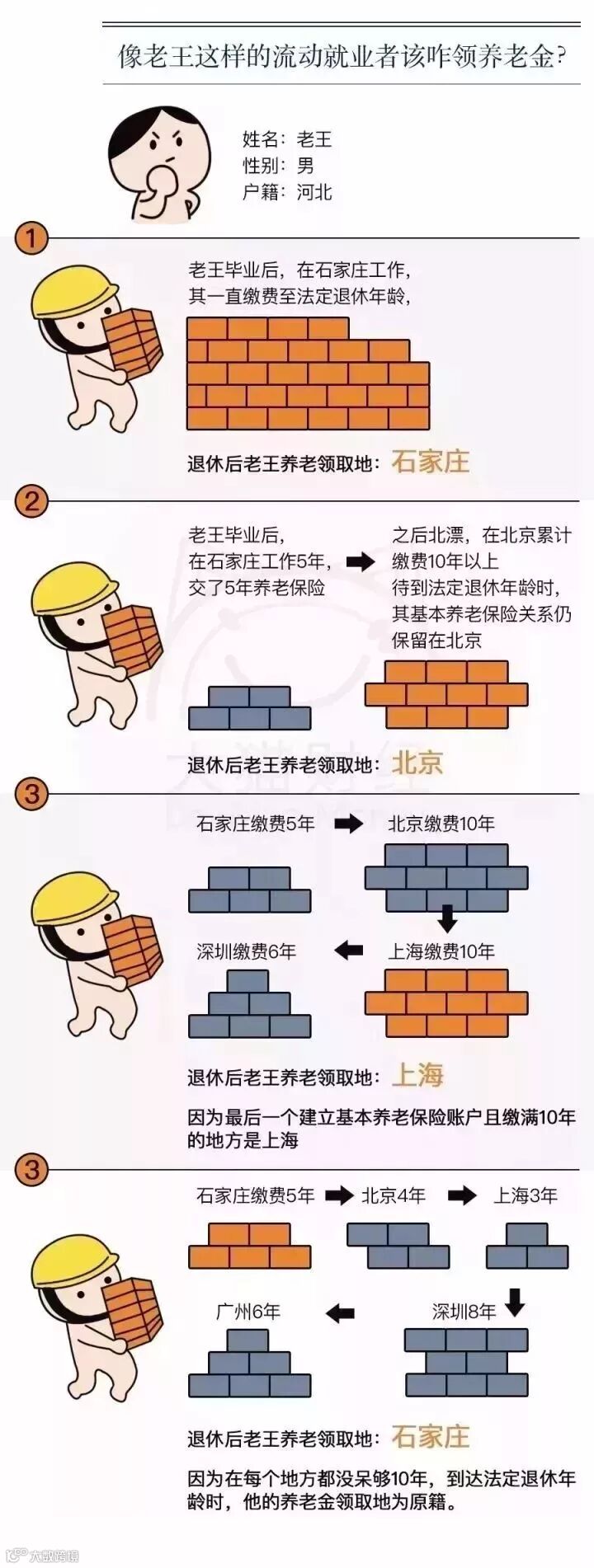 如果您老家的工资水平没有你工作过的地方高,建议你不要经常开启“流浪模式”,一定要确定其中有一个工作过的地区你累计缴满了10年!在哪个城市都呆不久对你的退休金影响是最大的!