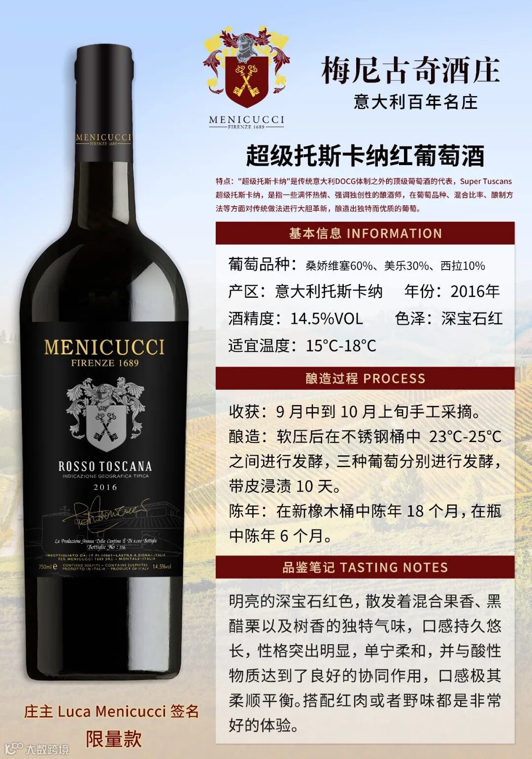 卢卡梅尼古奇先生至始至终都在用心经营酒庄,他不仅继承了梅尼古奇家族的血脉,也继承了家族300多年来为酒庄付出的心血,他不敢怠慢,在这片神圣的热土上,他在不断努力寻找灵感和契机,致力于让每一颗具有当地独特风味的葡萄发挥应有的价值,这是勤劳的梅尼古奇家族的初衷,托斯卡纳人淳朴的传统,意大利能工巧匠亘古不变的匠人情怀……