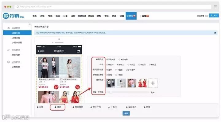 点击“商品”,可设置布局方式、样式、是否显示标题、价格是否加粗等。点击“+”可添加商品